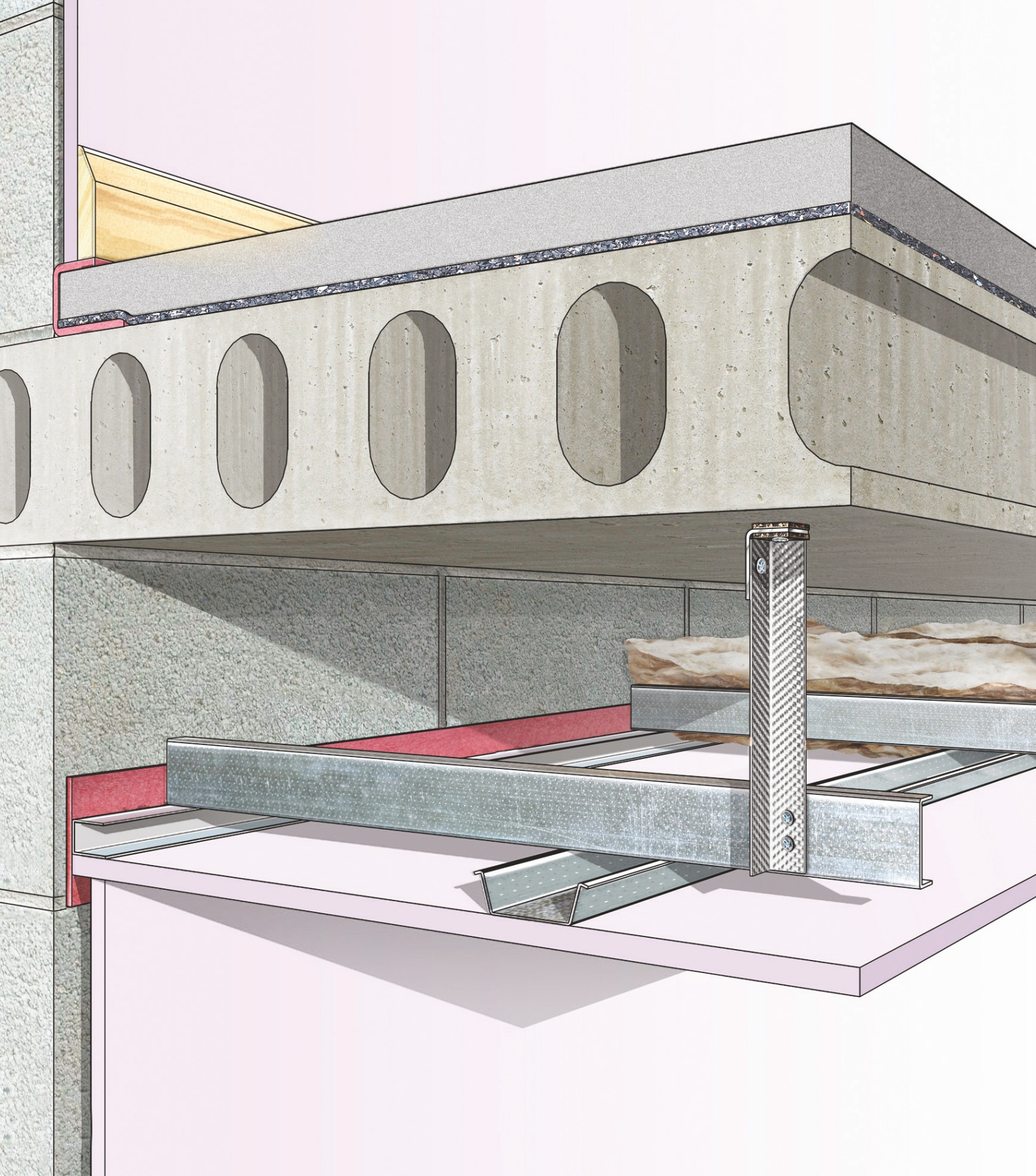 Robust Detail E-FC-14 is an acoustic solution for precast plank floors. This system provides a minimum 5dB improvement the requirements of Approved Document Part E. When registered with Robust Details Ltd the requirement for on-site sound testing is removed and 3 Code for Sustainable Homes / BREEAM / Home Quality Mark credits are automatically awarded.