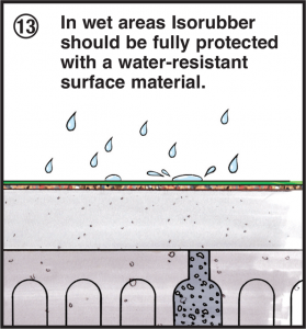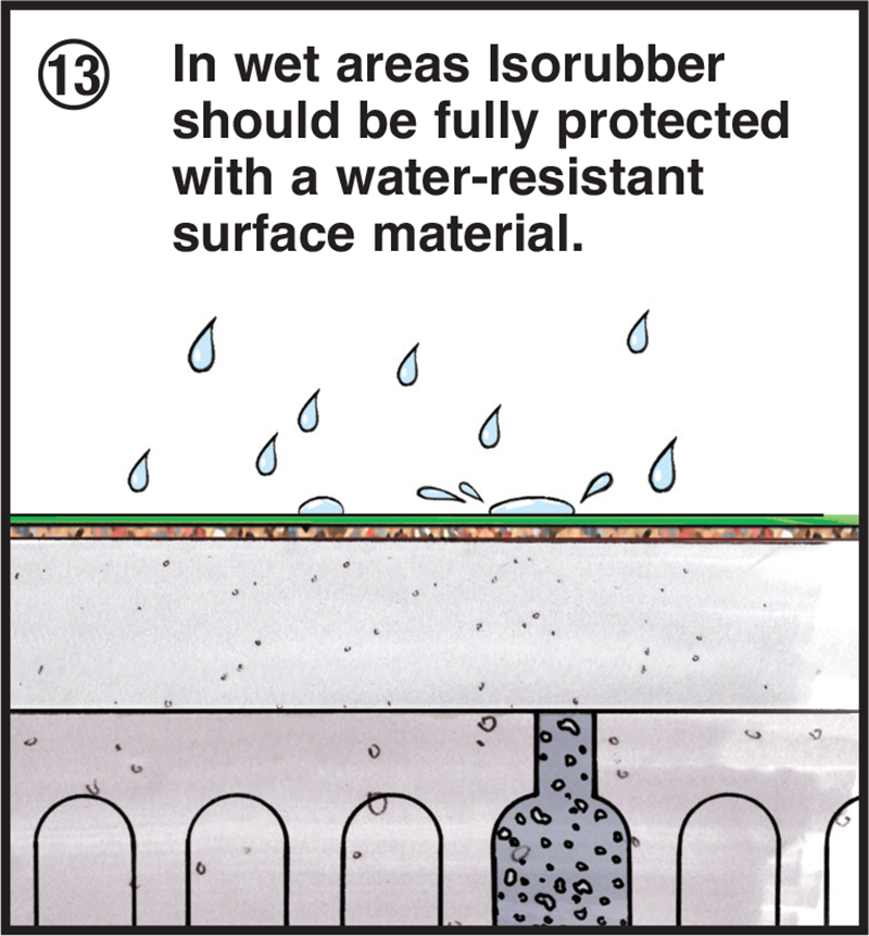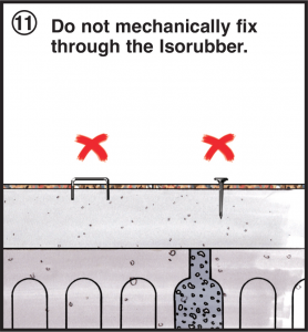 The E-FC-14 system consists of 6mm Isorubber Base fitted below a minimum 65mm sand & cement screed with Isoedge 6/260 separating the screed from the wall. The structural floor must be a minimum 150mm precast plank with a minimum mass of 300Kg/m2 per unit area. This system can be used with all masonry external flanking wall constructions (450 – 800Kg/m3, 1350 – 1600Kg/m3 & 1850 – 2300Kg/m3). A metal frame ceiling supported by Isosonic Cleats with a minimum void of 150mm or an Isosonic Ceiling is also required. Both ceiling details are under drawn with a layer of gypsum based board (minimum 10Kg/m2) and have a minimum of 50mm mineral wool in the ceiling void.