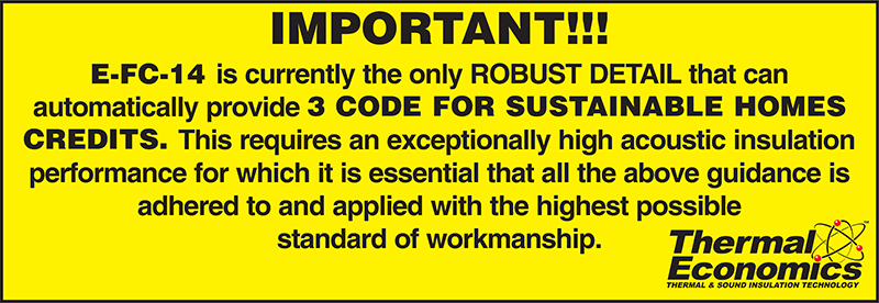 During the extensive site testing carried out for Robust Detail classification all 30 of the impact and airborne tests had to achieve a minimum 5dB improvement over regulation requirements to gain this status. Due to this excellent performance record any site that registers the E-FC-14 system with Robust Details is automatically awarded 3 Code for Sustainable Homes Credits.